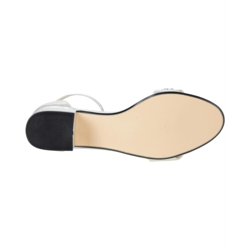 - Shimmery synthetic upper with rhinestone detail and adjustable ankle strap, featuring buckled closure.