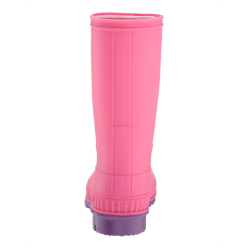 - Pull-on rainboots feature a smooth textile lining, removable shock-absorbing footbed, and a non-marking rubber outsole.