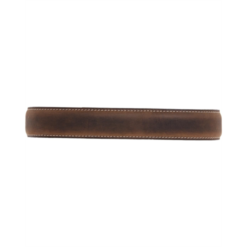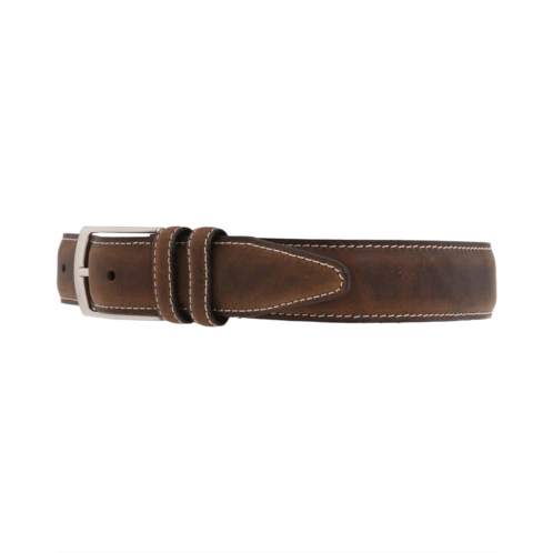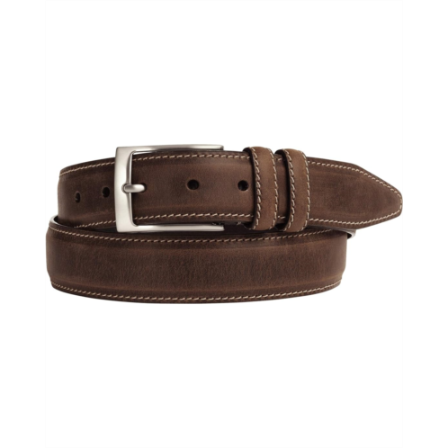 - With burnishing and a slightly distressed finish, this Johnston & Murphy belt is an instant modern favorite. It's made of genuine leather, and features contrast stitch details for an elevated finish.