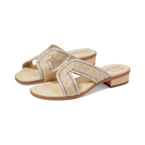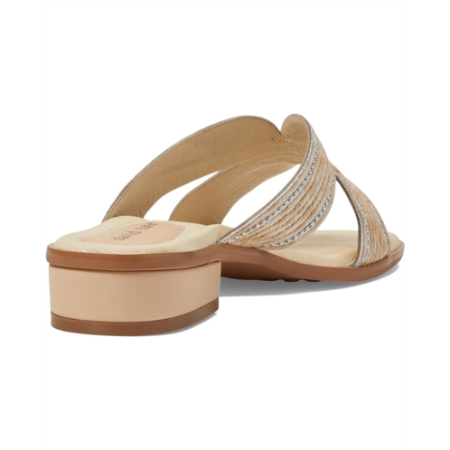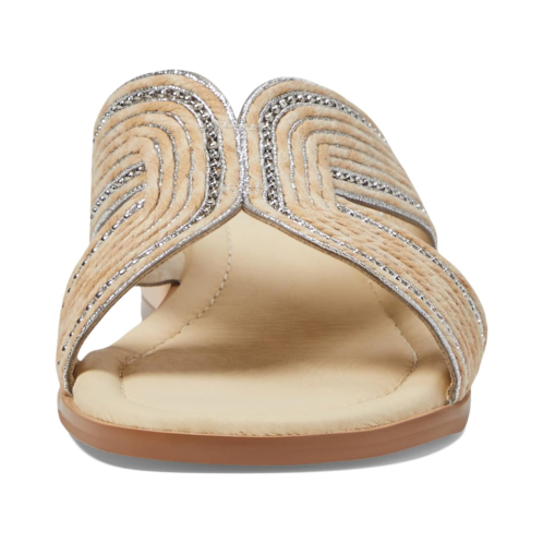 Thrill sandal. It is made with faux leather upper, leather-wrapped foam-padded insole, and faux leather lining. A slide combined corded fabric and metallic embellishment offer a unique fashion look. The sandal has a block heel for grip on the surface.