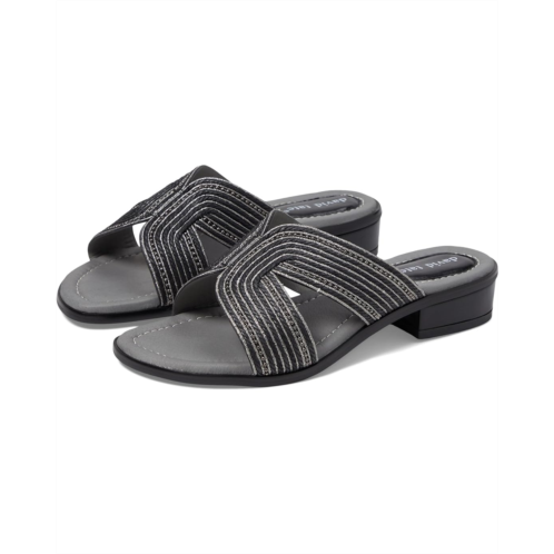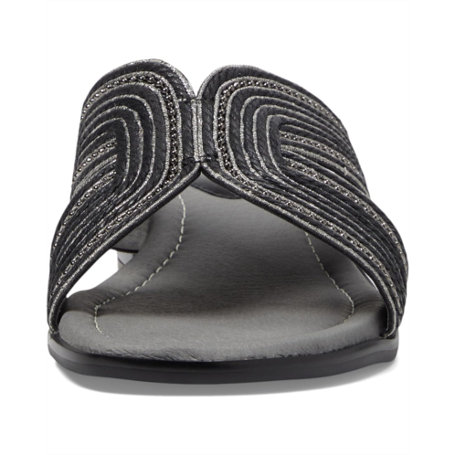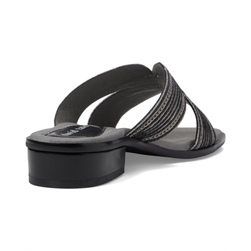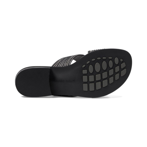 Thrill sandal. It is made with faux leather upper, leather-wrapped foam-padded insole, and faux leather lining. A slide combined corded fabric and metallic embellishment offer a unique fashion look. The sandal has a block heel for grip on the surface.