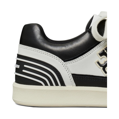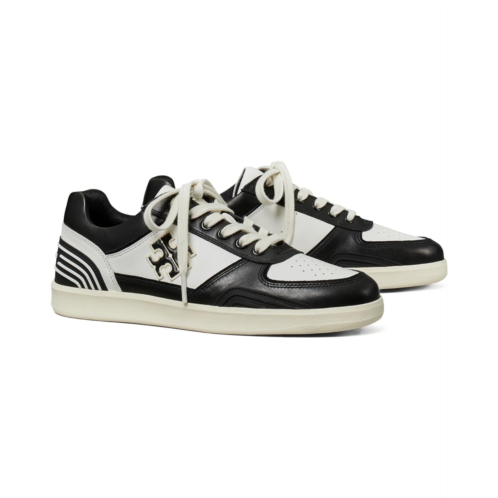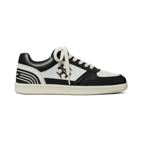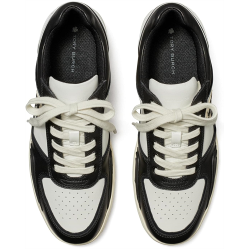 - Boasting a classic skate-inspired silhouette updated with modern style elements, the Tory Burch Clover Court Sneakers are enough to take your casual look to a whole new level. The upper of these shoes is constructed in durable bovine leather and polyurethane and showcases a round toe with perforations and a lace-up closure for a snug fit. The interior nylon and capra suede lining offers breathable comfort to make your walks pleasant.