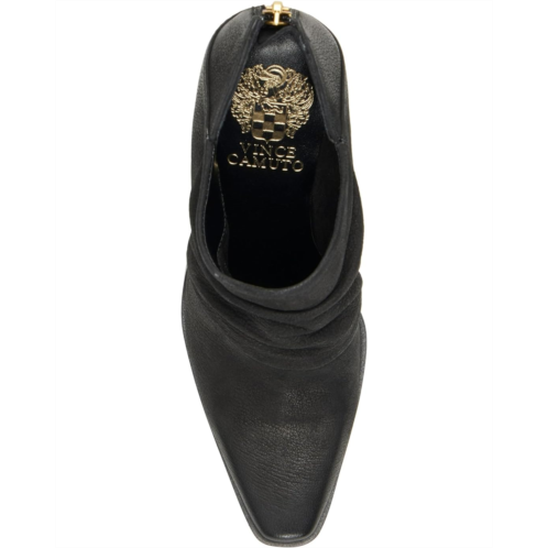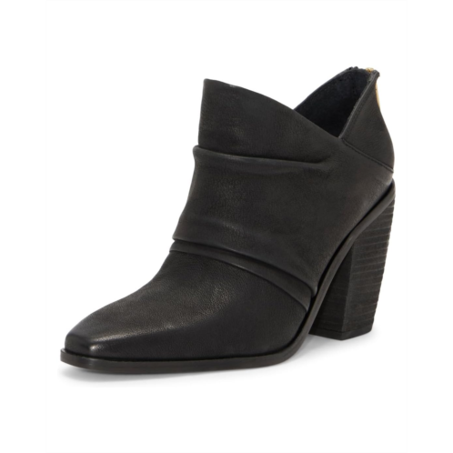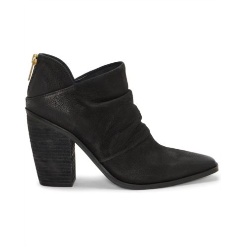 - Radiate poise and walk with confidence no matter where you go wearing the Vince Camuto Ainsley Boots. Sculpted with a snipped toe and balanced by a stacked block heel, these ankle booties feature a ruched leather upper with a scalloped topline and a zippered back closure.