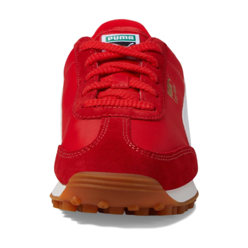- With its classic slim profile and vintage vibes intact, the PUMA Kids Easy Rider Sneakers boasts a truly timeless silhouette. The low-top sneakers feature a mixed textile upper with synthetic leather overlay, Suede overlay on toe and vamp, leather lining, and :ethylene vinyl acetate insole. While the suede heel comes with synthetic leather underlay, the debossed and printed puma branding, synthetic leather formstrip, and foil printed puma branding on quarter give the look an authenticity. The lace-up closure on the sneakers is designed for easy adjustability.