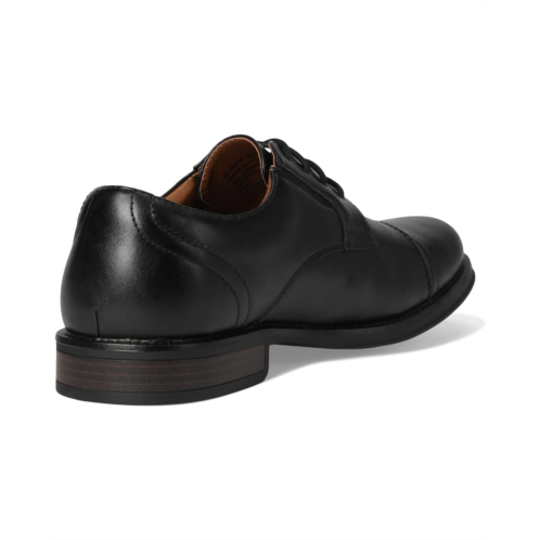 - Polished faux-leather uppers with a cap toe.