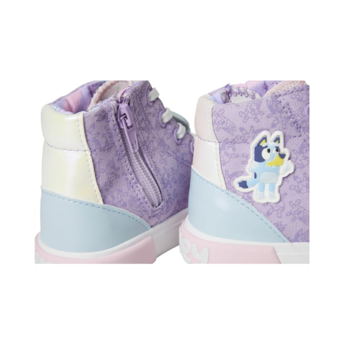 - Step into a world of fun sporting the Ground Up Bluey High Top! These vibrant sneakers feature a playful mix of watercolor canvas, shimmering pearlized PU, and glittery PU puff patches, bringing your child's favorite characters to life. The silver glitter laces add a touch of sparkle, while the lighted lace charm makes every step magical. With stitched characters, iridescent accents, and gel prints, these high tops are designed for style and comfort. A convenient zippered closure ensures easy on-and-off, making these shoes the perfect choice for energetic kids ready to explore in style.
