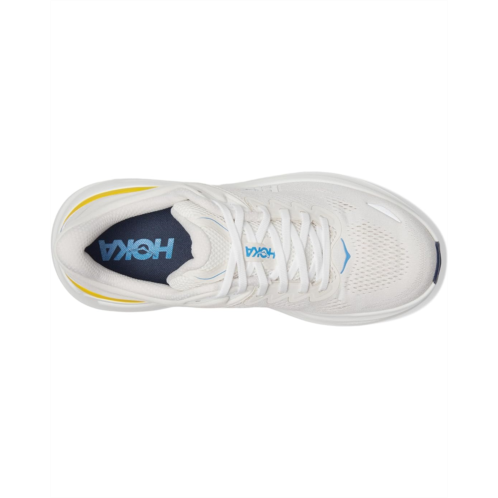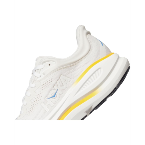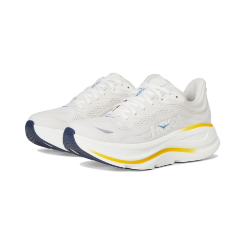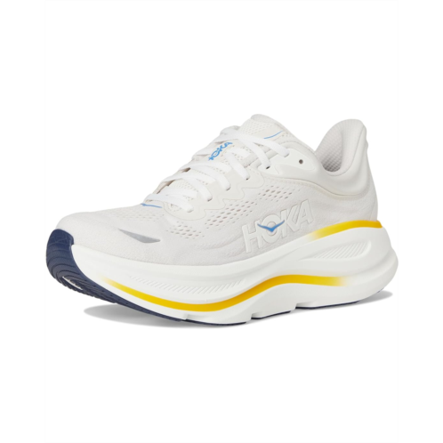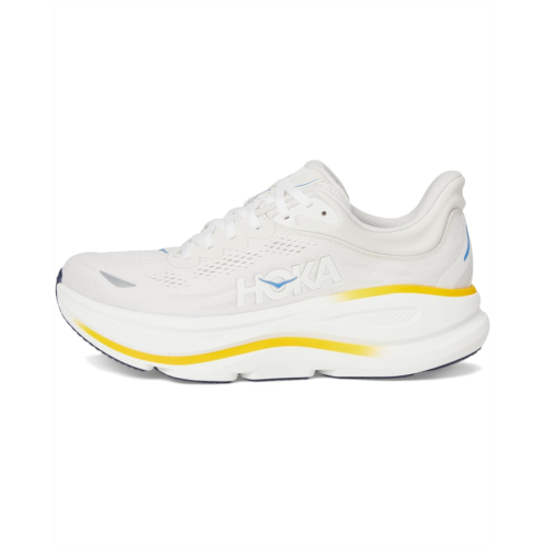 Romance: One of the hardest working shoes in the HOKA lineup, the Bondi 9 delivers peak plushness for everyday miles. Overhauled from top to bottom, we've increased the stack height and added a new premium foam midsole to deliver that soft, resilient ride that's become synonymous with the Bondi. Elevated with a 3D molded collar and structured knit upper with zonal breathability, this ultra-cushioned cult favorite has been finished with Durabrasion rubber to combat high wear zones. The upper is engineered with mesh and recycled polyester, reflective upper details, extended heel pull, and 3D molded collar. The super critically foamed EVA midsole features smooth MetaRocker, rearfoot-focused Active Foot Frame, and Molded EVA sockliner.