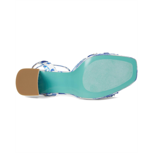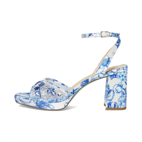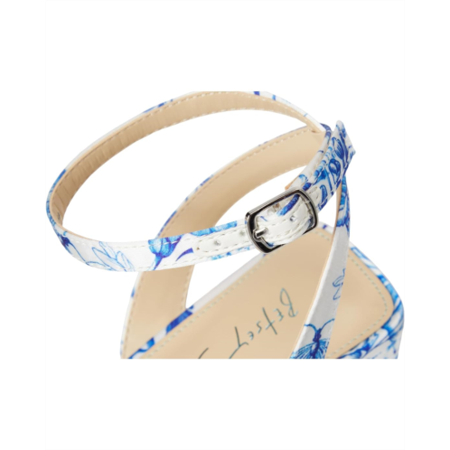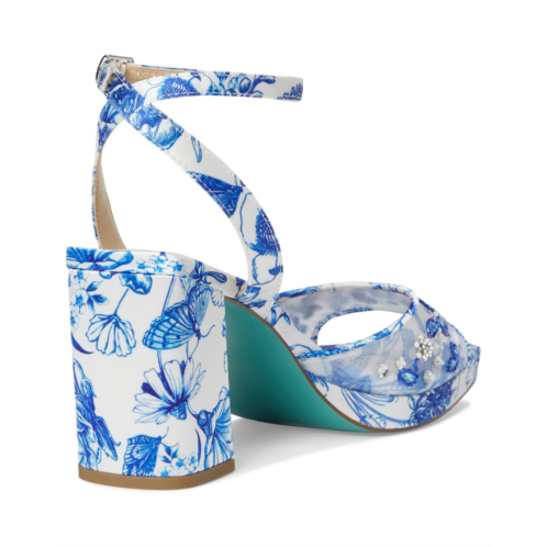 - The Blue by Betsey Johnson Brody sandals are flirty and fabulous with their allover floral print, floral embellishments, and playful block heels. These heeled sandals are made of a faux leather upper, insole, and lining. Their adjustable ankle strap offers a secure fit.
