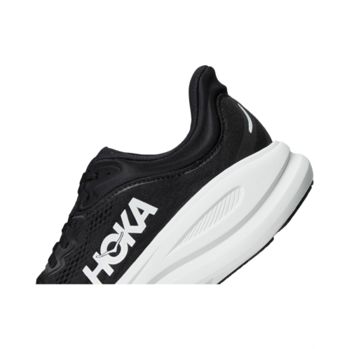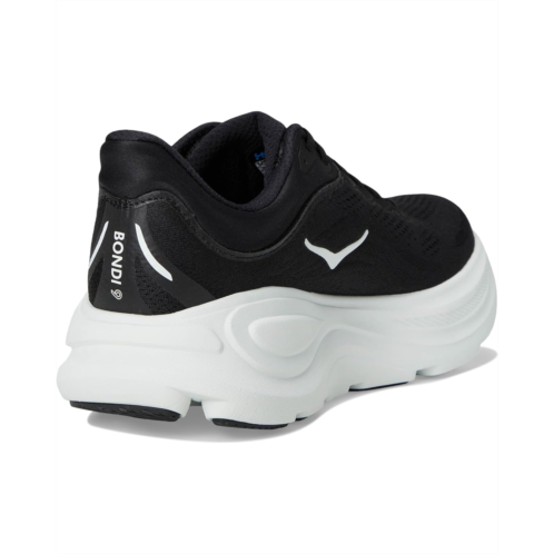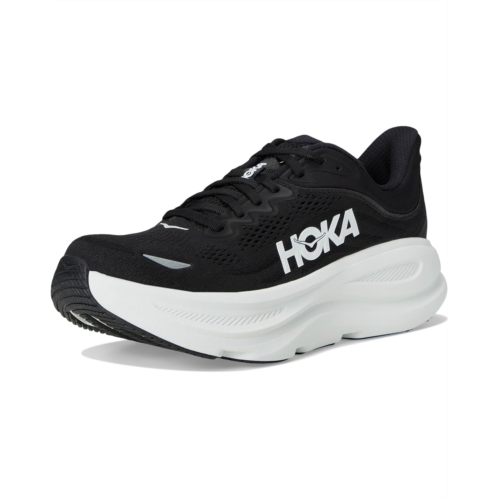 Romance: One of the hardest working shoes in the HOKA lineup, the Bondi 9 delivers peak plushness for everyday miles. Overhauled from top to bottom, we've increased the stack height and added a new premium foam midsole to deliver that soft, resilient ride that's become synonymous with the Bondi. Elevated with a 3D molded collar and structured knit upper with zonal breathability, this ultra-cushioned cult favorite has been finished with Durabrasion rubber to combat high wear zones. The upper is engineered with mesh and recycled polyester, reflective upper details, extended heel pull, and 3D molded collar. The super critically foamed EVA midsole features smooth MetaRocker, rearfoot-focused Active Foot Frame, and Molded EVA sockliner.