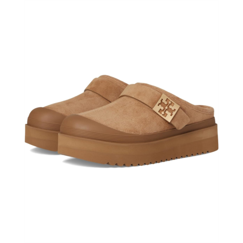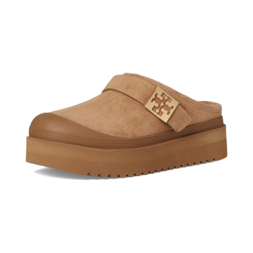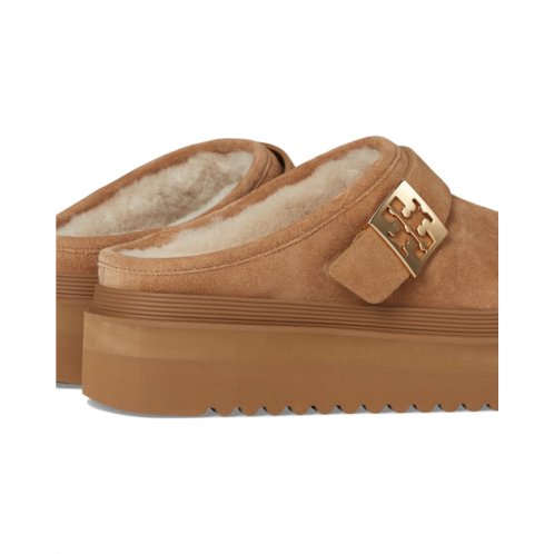 - Slip into cozy warmth on your laidback day in the Tory Burch Mellow Shearling Platform Mule. These slip-on style shoes feature a round toe silhouette with a decorative metal Double T hardware, crafted from a suede upper with a platform footbed.