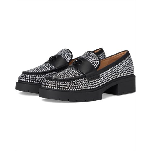 - A perfect footwear choice to match your formal outfits and casual looks, the COACH Leah Loafer With Crystal works for different occasions. These heeled loafers are crafted with a man-made leather lining and footbed for superior comfort and durability. The suede and leather upper features rhinestone detailing allover for an eye-catching appeal. These leather loafers make a great addition to your footwear collection.