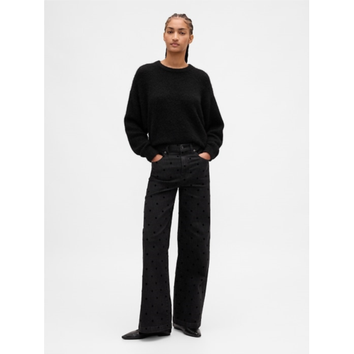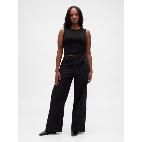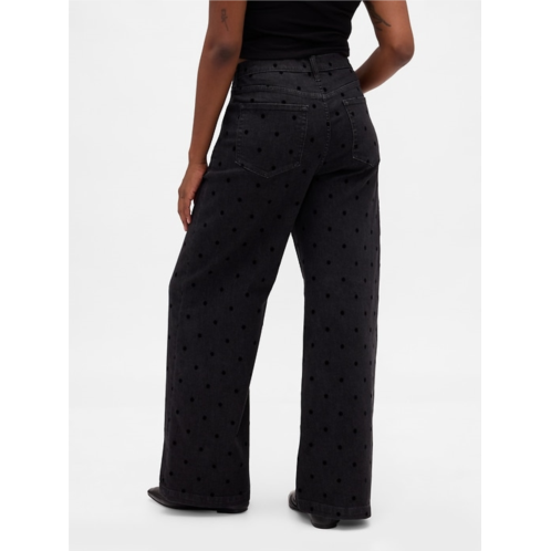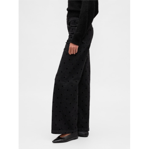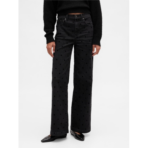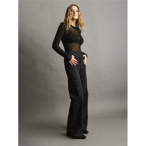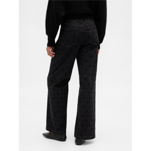 - Details: Zip fly, five-pocket styling, & allover flocked polka dots.