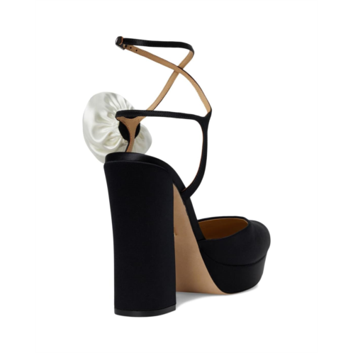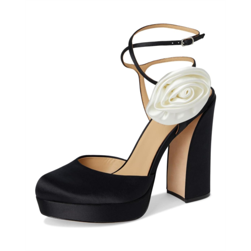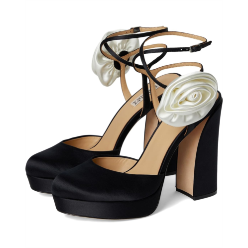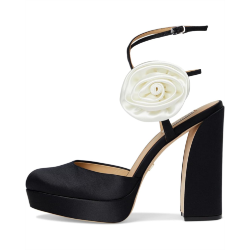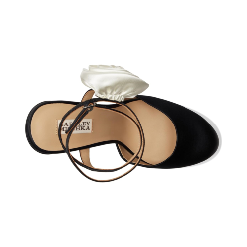 - Discover a new level of elegance wearing Badgley Mischka Janessa - a stunning blend of sophistication and statement-making style. Featuring a luxurious silk upper adorned with an oversized flower, these platform pumps are your go-to for standout occasions. The leather lining and outsole promise breathable comfort, while the EVA insole cushions every step. A sleek buckle ankle strap ensures a secure fit, and the block heel adds height with stability.