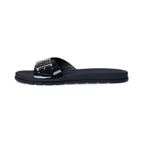 - Simple yet impressive, the Tory Burch Buckle Slide Sandals perfectly upgrade your warm weather style without affecting your comfort game. The shoes are lightweight and water-repellent and come with a polyurethane upper accented with a plastic hinged buckle, a leather lining, and a cushioned compression-molded EVA footbed.