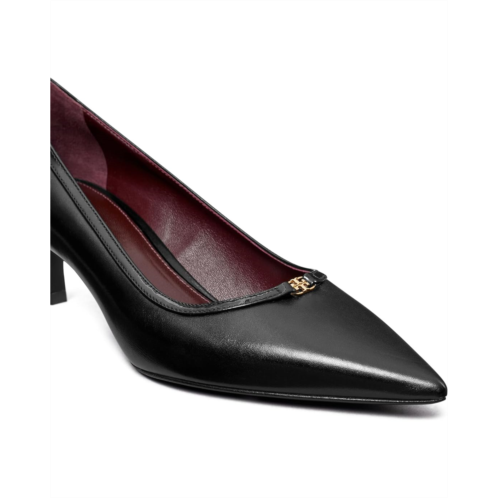 - Beautifully designed in a pointed toe silhouette with a durable T buckle hardware at the vamp, the Tory Burch Double T Buckle Kitten Heel Pumps 45mm brings along a refined charm. These are crafted with a leather upper, breathable leather lining, and a leather insole. The low-top pumps feature a tall stiletto heel.
