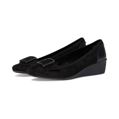 - The Anne Klein Wyatt is a refined staple that features a squared toe and a suede upper, elevated by a patent-texture heel counter. The padded polyurethane insole ensures all-day wearability, while the rubber traction outsole provides stability with every step. Set on a sleek wedge heel, this versatile pump transitions effortlessly from office to evening.
