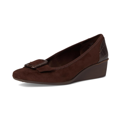 - The Anne Klein Wyatt is a refined staple that features a squared toe and a suede upper, elevated by a patent-texture heel counter. The padded polyurethane insole ensures all-day wearability, while the rubber traction outsole provides stability with every step. Set on a sleek wedge heel, this versatile pump transitions effortlessly from office to evening.