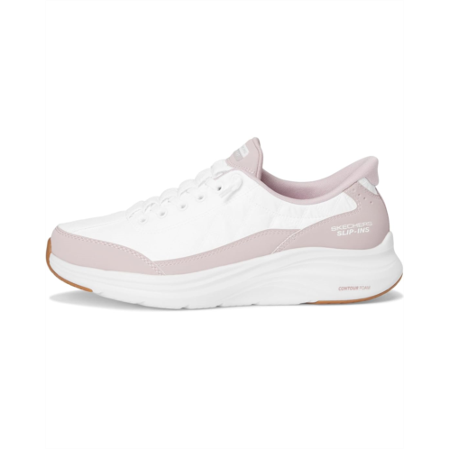 - Stay stylish and stay moving wearing the SKECHERS Contour Foam - Cozy Fit Hands Free Slip-Ins. Crafted from rubber upper, and insole, this pair of shoes features round toe, lace detailing, pull-on style, air-cooled memory foam, cozy fit, vapor foam, and brand detailing on the tongue, and footbed.