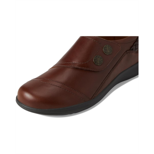 - Leather upper with a round toe and adjustable hook-and-loop fastener under decorative buttons.