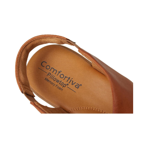 - The Comfortiva Emilee sandals are perfect to pair with different outfits and styles. These heeled sandals are made of a foam insole, microfiber cushioned sock, and faux suede lining. The leather upper is styled with a cross-band design and an elasticized gore sling for a better fit.