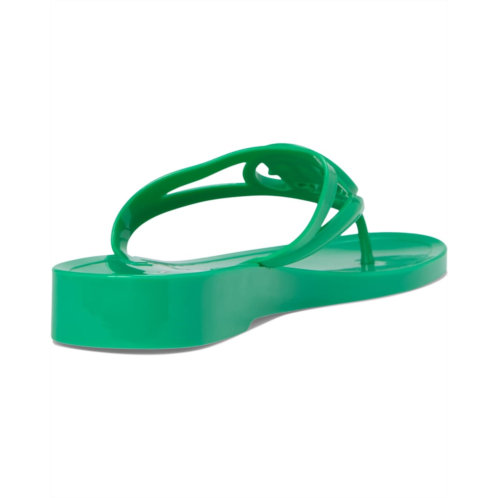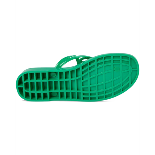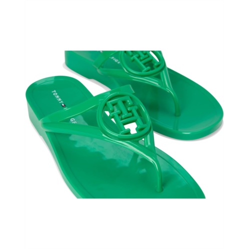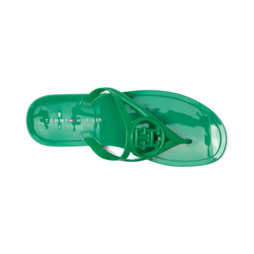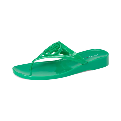 - The Tommy Hilfiger Women's Vedna jelly flip-flop with a low edge and instantly recognizable logo perfectly balances this signature style with a fresh attitude. Crafted from polyester upper, lining, and leather insole, this pair of sandals features open square toe, slip-on style, low-top silhouette, and brand detailing on the footbed.
