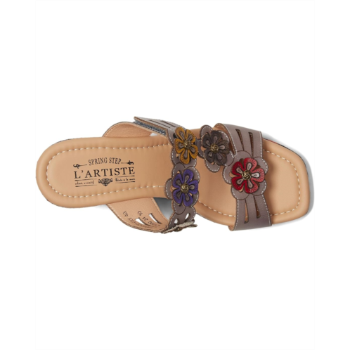 - The L'Artiste by Spring Step Caprice sandals are designed with a luxe leather upper with charming floral appliques cascading along the asymmetrical strap. Their hook-and-loop closure ensures a secure fit. These heeled sandals are made of a faux leather insole and lining. Stylish and comfortable, these slip-on sandals are perfect to pair with different outfits and styles.