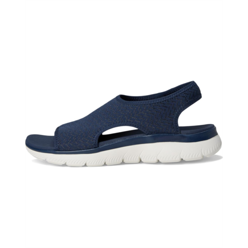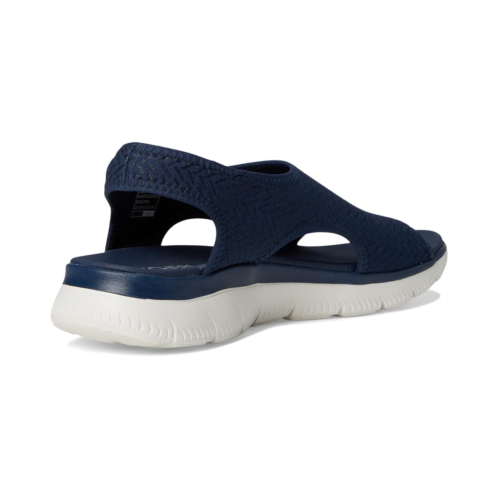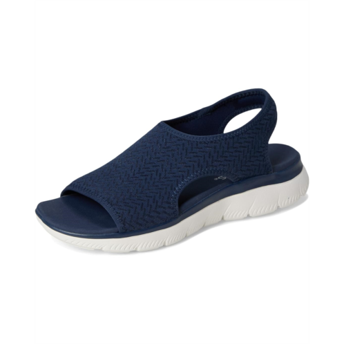 - Ease back with style and stretchable comfort wearing the SKECHERS Summits - Outta Here sandals. The textured Stretch Fit neoprene upper features a H-band design and an all-over chevron print. These athletickorea sandals are made of a Yoga Foam cushioned footbed, lightweight shock-absorbing midsole, and leather lining. Machine washable and durable, these slingback sandals are crafted with 100% vegan materials.