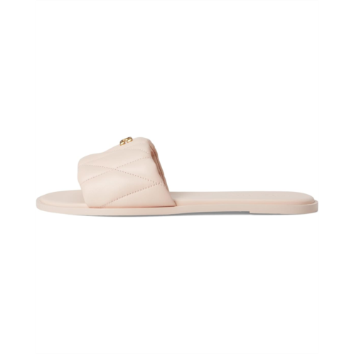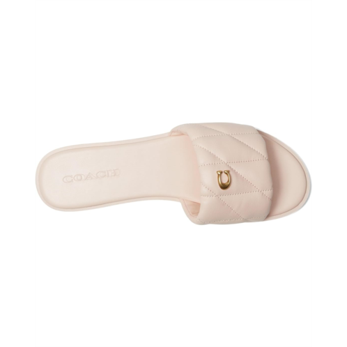 - Enjoy the barefoot freedom wearing the COACH Holly Sandals with Quilting. Crafted from leather upper, man-made leather lining, and rubber insole, this pair of sandals features open round toe, low heel, quilted wide strap on the vamp with gold-tone logo emblem, slip-on style, and brand detailing on the footbed.