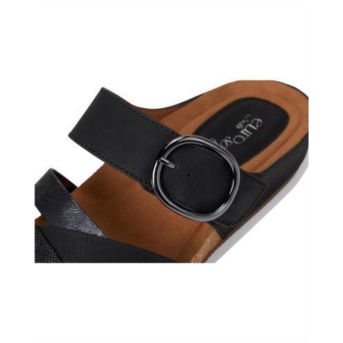- Walk gracefully wearing the EuroSoft Genalyn. Crafted from faux leather upper, faux suede lining, and foam insole, this pair of footwear features open round toe, slip-on style, padded micro suede footbed, adjustable hook and loop strap, multi material upper, cork wrapped footbed.