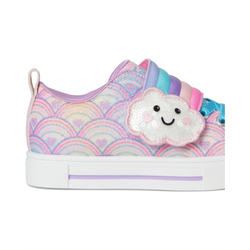 • Sparkle and shine your steps in superstar style wearing the SKECHERS KIDS Twinkle Sparks - Cloud Cutie 314828L. This light-up design features glittery synthetic rainbow cloud print upper with an adjustable cloud-rainbow instep strap closure, and Twinkle Toes light-up rhinestone embellished toe cap. The low-top shoes feature cotton lining, cushioned comfort insole, and shock-absorbing vulcanized midsole.