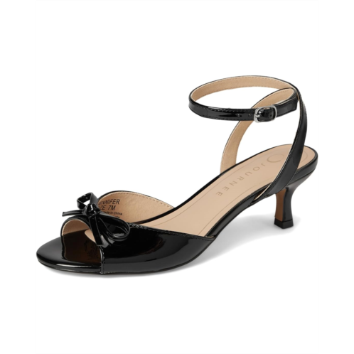 - The Journee Collection Jennifer heels will be the perfect finishing touch to your outfit with their bow detail. Made with patent faux leather, a buckled ankle strap, and an open round toe shape, this design will give you all the style you need to leave your house with a boost of confidence. These heeled sandals are made of a faux leather insole and polyurethane lining. Continuing to keep your feet happy, their padded footbed will leave your feet on top of the world with how comfortable they will feel.
