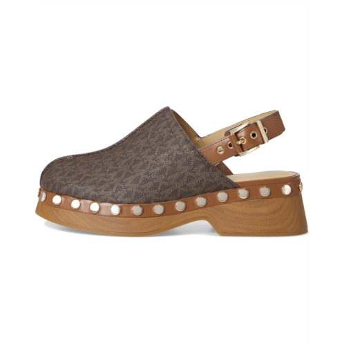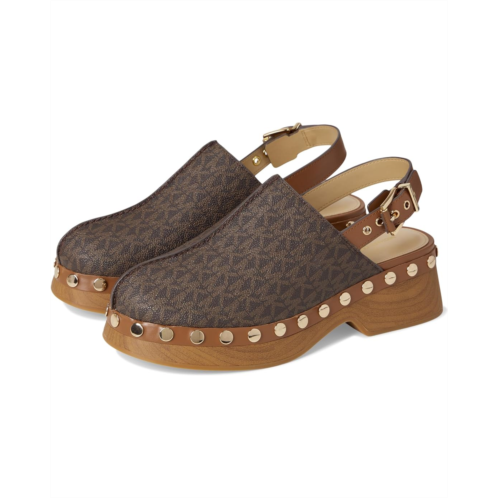 - Prepare to step out in style donning the MICHAEL Michael Kors Esra Clogs! Combining comfort and style, this slingback clog boasts a buckle closure on a printed wooden platform, complete with eye-catching, rounded stud nail embellishments on the side.