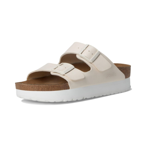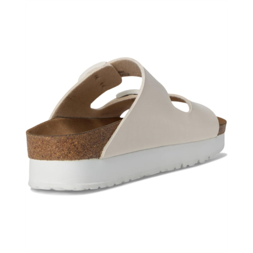 - Walk the toughest paths while being super comfortable wearing Birkenstock Papillio by Birkenstock Arizona Platform Sandal - Vegan Flat Sandals. This slip-on footwear features a Birki-Flor synthetic upper construction with buckled straps, microfiber lining, and EVA cushioning cork footbed.