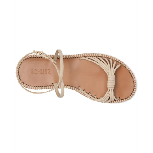- Look elegant and graceful wearing the Schutz Livia Flat. Crafted from leather upper, lining, and insole, this pair of sandals features open round toe, strappy upper, ankle strap, buckle closure, low stacked heel, and brand detailing on the footbed.