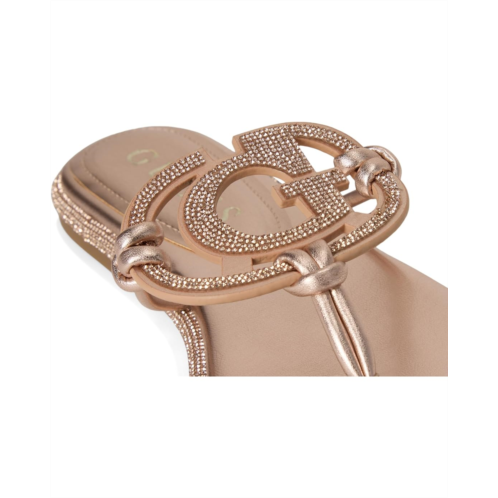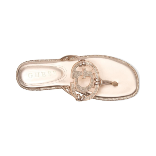 - The sandal of the season has arrived, the GUESS Saima is here to shine. A cut out G logo embellished with all over rhinestones brings a luxe look to your everyday flat sandal. Est. 1981, guess is a global lifestyle brand and a symbol of a young, adventurous lifestyle. Crafted from PU upper, and man-made lining, this pair of flats features open round toe, and brand detailing on the footbed.