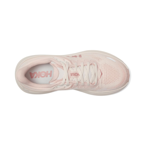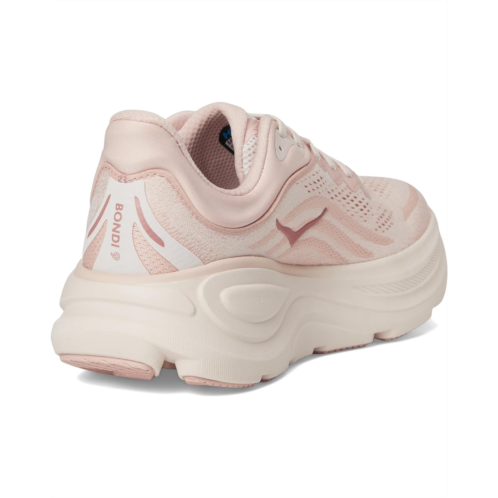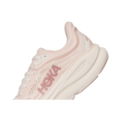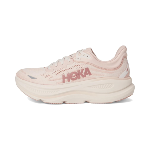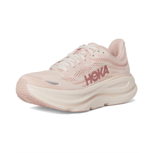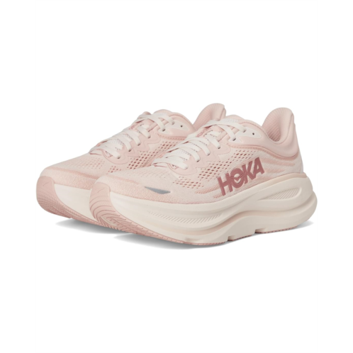 Romance: One of the hardest working shoes in the HOKA lineup, the Bondi 9 delivers peak plushness for everyday miles. Overhauled from top to bottom, we've increased the stack height and added a new premium foam midsole to deliver that soft, resilient ride that's become synonymous with the Bondi. Elevated with a 3D molded collar and structured knit upper with zonal breathability, this ultra-cushioned cult favorite has been finished with Durabrasion rubber to combat high wear zones. The upper is engineered with mesh and recycled polyester, reflective upper details, extended heel pull, and 3D molded collar. The super critically foamed EVA midsole features smooth MetaRocker, rearfoot-focused Active Foot Frame, and Molded EVA sockliner.