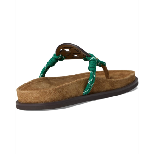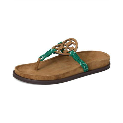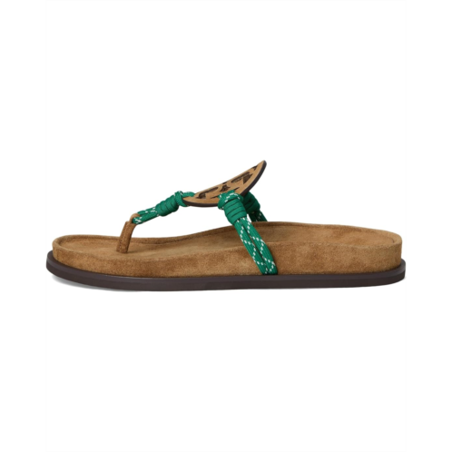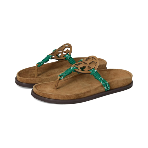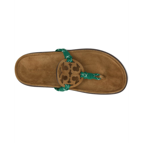 - The Tory Burch Miller Rope Cloud sandals with an iconic T-logo add a statement touch, seamlessly pairing with jeans, dresses, or shorts. Made with a combination of leather and polyester rope strap upper adorned with a graphic logo, these sandals are a chic addition to any outfit. The laser-cut detailing, complete with hand-painted edges, showcases the attention to detail in these sandals. Featuring a breathable leather lining and a molded insole wrapped in soft leather, these sandals offer unbeatable comfort. The dual-density foam core provides flexibility and rebound.