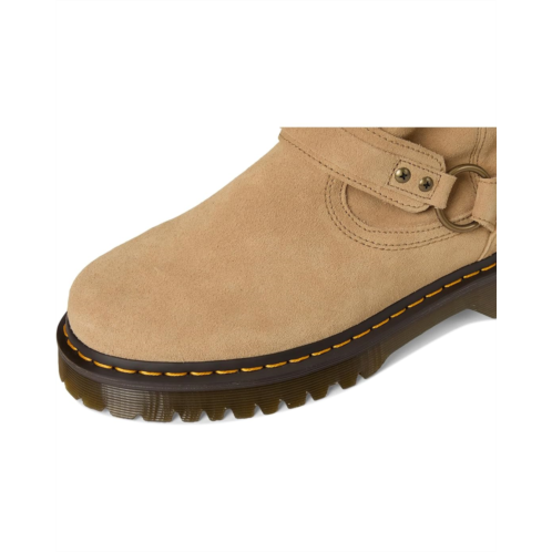 - Low-built but high-impact. The Dr. Martens Anistone Harness biker boot is a collision of practical utility and standout aesthetics. Crafted in Crazy Horse leather for a rugged finish that ingrains deeper with wear. The silhouette is wrapped in a harness and added a buckle on the side, both in antique brass. The scripted heel loop and yellow welt stitching give the boot a recognizably DM's stamp, while the trans Bex sole delivers a little extra height.