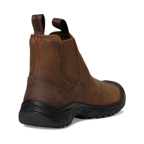 - The KEEN Anchorage 4 Waterproof Pull-On Durable Insulated boots are rugged slip-on cold-weather boots, updated with a glue-free fused construction for long-lasting durability. They have a premium leather upper, lightweight insulation, and PFAS-free waterproof protection for all-weather wear. Their premium leather looks good with jeans or slacks, while waterproofing, insulation, and a snow-friendly rubber outsole make them ideal for cold-weather wear. These ankle-high boots are made of a polyester insole and feature KEEN.FUSION direct-attach construction that provides long-lasting cushioning and reduces the chance of footwear separating over time, because the best boot is the one you keep wearing. Made with durable, waterproof leather and KEEN.WARM insulation, these pull-on snow boots for men are built on KEEN's traditional wider footwear form.