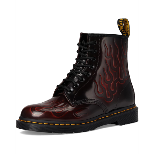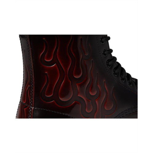 - The classic Dr. Martens 1460 boot constructed from Arcadia, a high-shine archival leather that exposes more of the base cherry red tone through wear. The upper features embossed flames.
