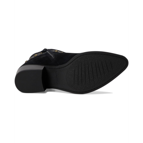 - The Clarks Morzine Buckle ankle boot lands in soft suede for a classic, premium look. The pair is completed with authentic topstitching, shiny buckles and a super-soft footbed for total comfort and a polished aesthetic. And, offering easy-walk support that powers every move, it's all tied together with an ultra-wearable stacked heel.