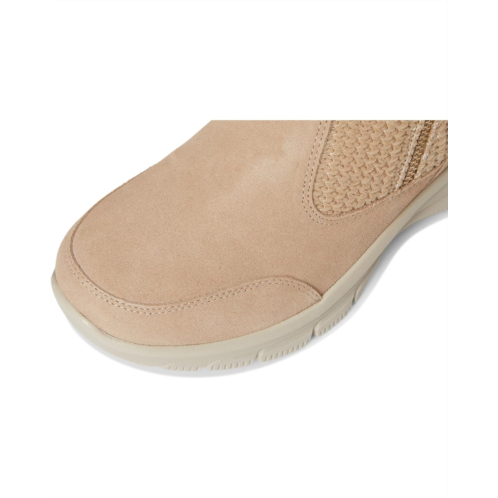 - Style that feels like a hug, SKECHERS Easy Going - Gentle Fall. Designed to keep you warm and on-trend, this ankle-high beauty features a soft suede and sweater knit upper accented with a plush faux-fur trim that screams cozy season goals. The zippered side closure makes slipping in and out a breeze, while the moc toe and wedge heel add just the right touch of laid-back sophistication. Inside, the SKECHERS Air-Cooled Memory Foam cushioned insole hugs your feet in unmatched comfort, and the durable rubber outsole ensures grip with every step.