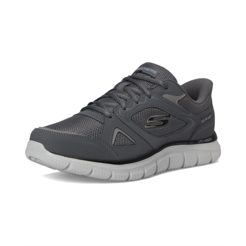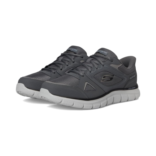 - Step into easy-wearing comfort with the SKECHERS Track Ezral Hands Free Slip-in shoes. Designed with an exclusive Heel Pillow that holds your foot securely in place, these slip-on sneakers feature an overlay synthetic resin upper with a flexible slip-on front for a comfortable fit and traditional laces that allow you to lace them up once for the perfect support and slip right in. The faux leather lining offers all-day comfort, while the cushioned, gel-infused Skechers Air-Cooled Memory Foam insole provides pressure relief, instant comfort, breathability, and contours to most foot shapes. Add performance comfort to casual occasions with these lace-up shoes. Wear them indoors, around the house, to and from work, business, for travel, or even while driving; the possibilities continue.