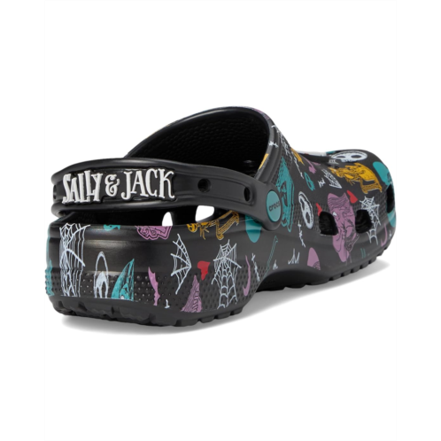 - The Crocs Jack Skellington Nightmare Before Christmas Classic Clogs are a spooky-chic tribute to Tim Burton's iconic Pumpkin King. These pull-on clogs feature Jack Skellington's signature suit pattern, complete with a bat bow tie motif, and come with glow-in-the-dark Jibbitz charms that add eerie flair. Built from durable Croslite resin, they offer lightweight comfort, ventilation ports for breathability, and a pivoting heel strap for a secure fit. Whether you're haunting Halloween parties or just strolling through everyday shadows, these clogs deliver 360-degree Crocs comfort with a frightfully fun twist.