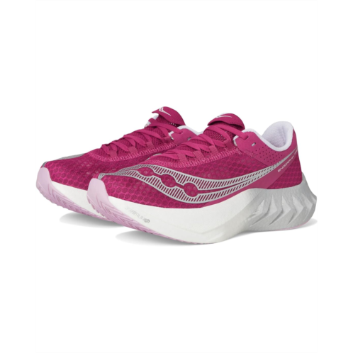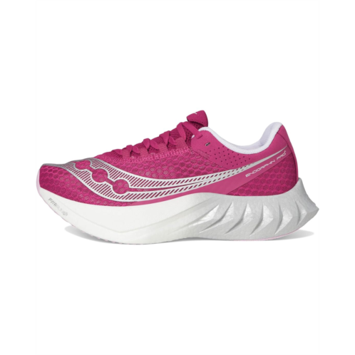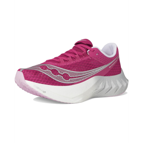 - Reach your destination without feeling tired wearing Saucony Endorphin Pro 4 sneakers. It has textile/synthetic upper, textile lining, and PWRRUN PB removable footbed. A lace-up closure, round bump toe, and padded collar provide right support on stress points. A colorful signature pattern give stunning look to the sneakers.