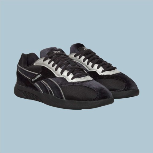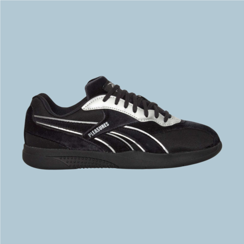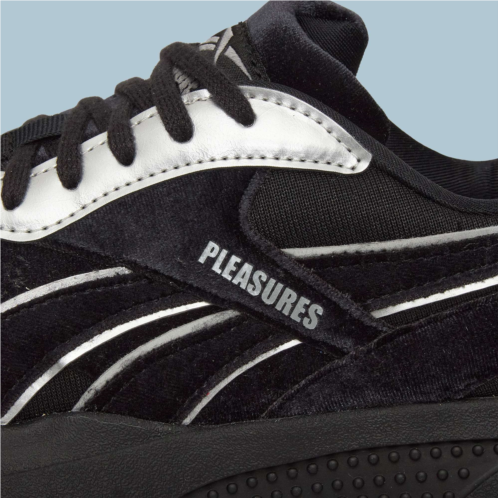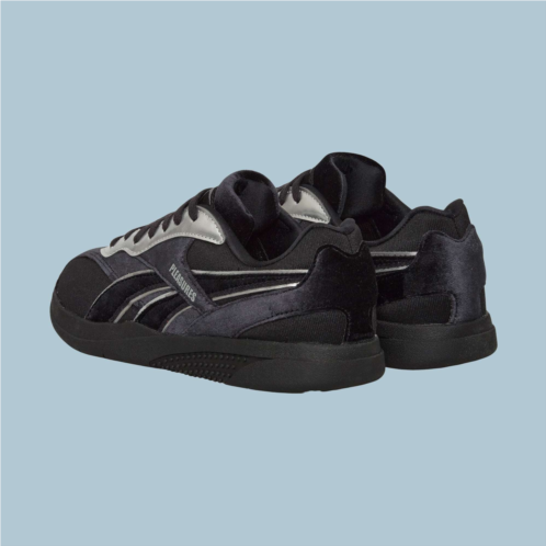 Rooted in Reebok’s ‘90s indoor soccer archives and reimagined in collaboration with PLEASURES, these shoes channel the grunge and punk aesthetic the LA-based streetwear label is known for. They feature a velvet upper with silver leather accents, finished with custom branding on the window, tongue, and footbed.