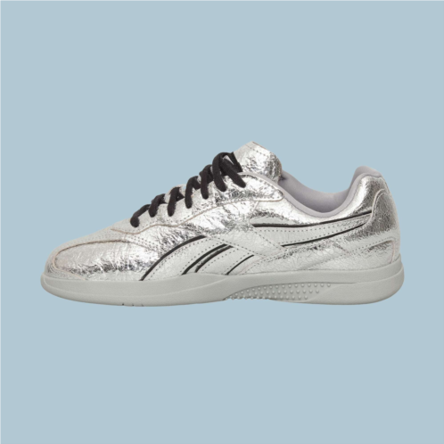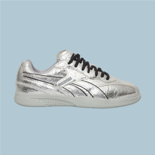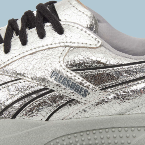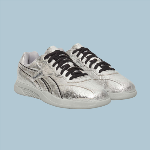 Rooted in Reebok’s ‘90s indoor soccer archives and reimagined in collaboration with PLEASURES, these shoes channel the grunge and punk aesthetic the LA-based streetwear label is known for. They feature a silver crinkled leather upper with black leather accents, finished with custom branding on the window, tongue, and footbed.