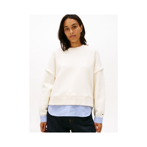 Tommy Hilfiger women's sweatshirt. Made from soft, brushed-back fleece, our sweatshirt features a striped poplin shirttail and cuffs, creating an effortlessly layered lookwithout the bulk.