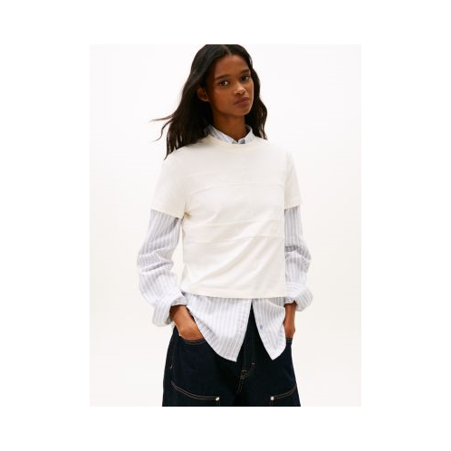 Tommy Hilfiger women's T-shirt. This acid-washed tee is made from garment-dyed cotton jersey for a soft, lived-in feel. It's finished with our embroidered tonal logo at the chest for a low-key look. Part of our Tommy Jeans collection.