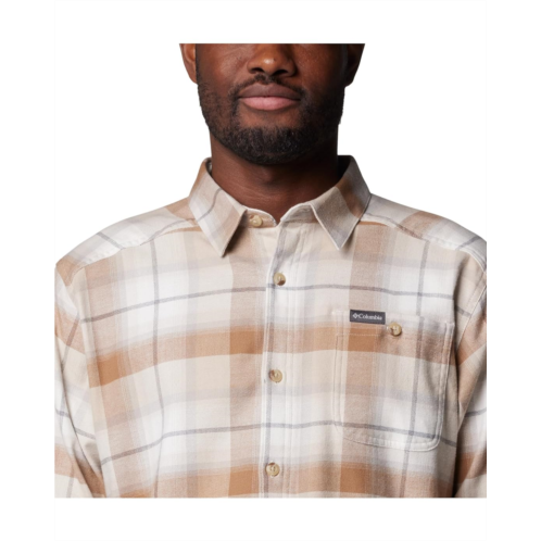 Constructed from soft cotton flannel with built-in stretch, this Columbia Cornell Woods Flannel Long Sleeve Shirt adeptly transitions from dinner to day job to the outdoor activity of your choosing. It features a regular-fit silhouette, collared neck, button-front closure, long sleeves with buttoned cuffs, one patch pocket on the left chest with an embroidered logo, and an allover checkered print. The shirttail hem gives the whole look a sophisticated touch.